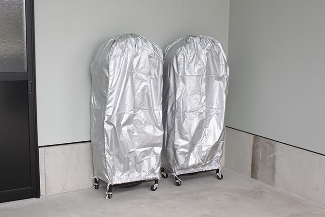 裾の4か所にはヒモが付いているので、ラックに結んで固定すればめくれることがなく安心して保管できます。