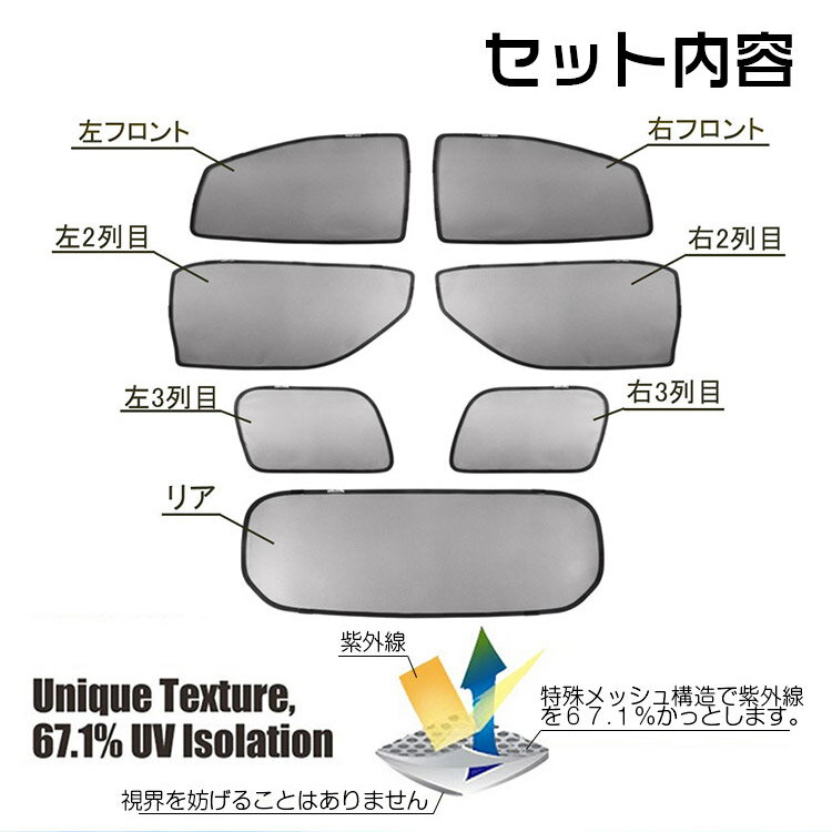 ) 商品仕様: ●状態:新品 未使用 ●商品セット:右フロント X1枚 左フロント X1枚 右2列目 X1枚 左2列目 X1枚 右3列目 X1枚 左3列目 X1枚 リア X1枚 商品特徴: ●高い熱遮断率と省エネ:メッシュ仕様ですので高い熱遮断率を持ち、車外からの日差しをシャットアウトし、エアコン動力を軽減、燃費の向上に役立ちます。